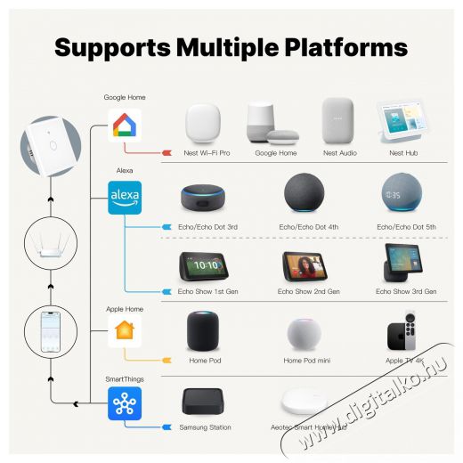 | Kompatibilis alkalmazások | Apple Home, MOES, Samsung SmartThings, Smartlife, Tuya |