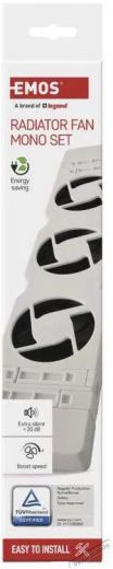 EMOS MONO radiátor alá helyezhető ventilátor, fehér Nem szereted a hideget? Az EMOS MONO radiátor alá helyezhető ventilátor gyorsabb és egyenletesebb hőeloszlást biztosít a helyiségben, csökkentve ezzel a termosztát magas hőmérsékletének szükségességét. A ventilátor két fokozatú áramlási sebességet és automatikus be-/kikapcsolási funkciót kínál. A fő előnyök közé tartozik az egyszerű telepítés és a legtöbb fűtőelemhez való csatlakoztatás lehetősége. Ez a típusú EMOS ventilátor legfeljebb 30 m³-es helyiségekbe alkalmas, a csendes működés (mindössze 20 dB) pedig biztosan kellemes meglepetést nyújt.
