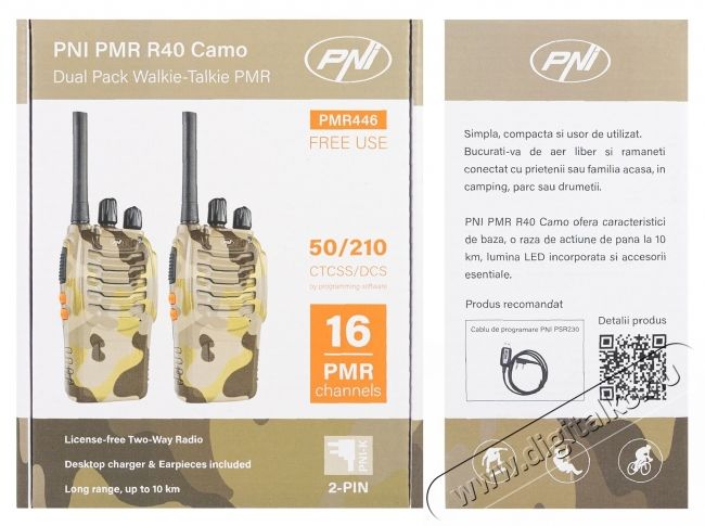 PNI PMR R40 Camo hordozható rádióállomás, 2, 0,5 W-os, 16 programozható csatorna készlet, 16 PMR és 50 CTCSS és 104 DCS hang, ASQ, TOT, monitor, programozható, 1200 mAh akkumulátor, töltő és fejhallgató mellékelve